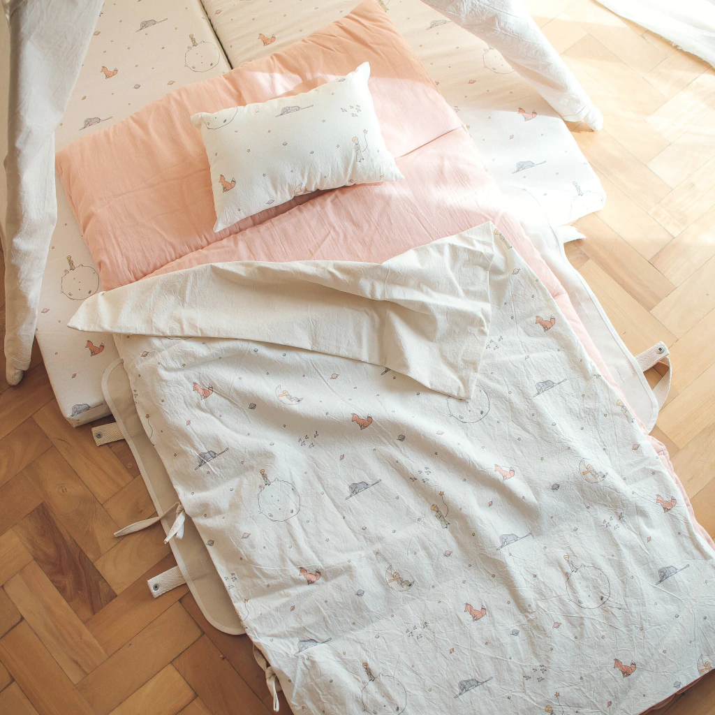 - La manta y la almohada estan confeccionadas en tela de algodón estampada con un diseño exclusivo de Pequeños Caciques inspirado en El principito.