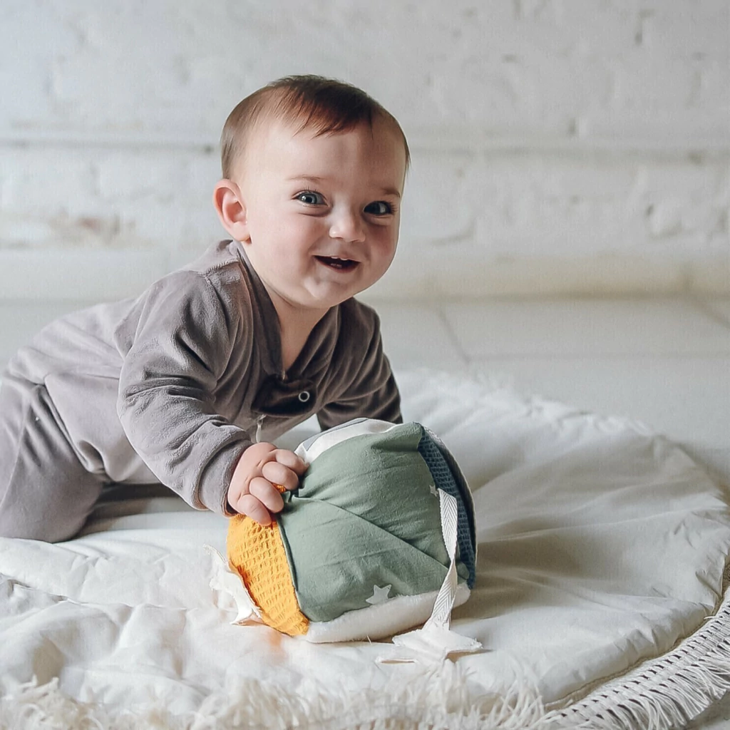 Cubo sensorial con colores, texturas, sonidos suaves y elementos.